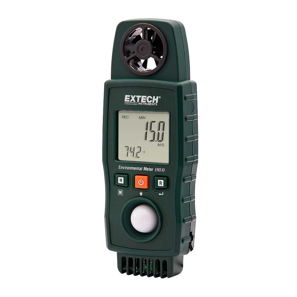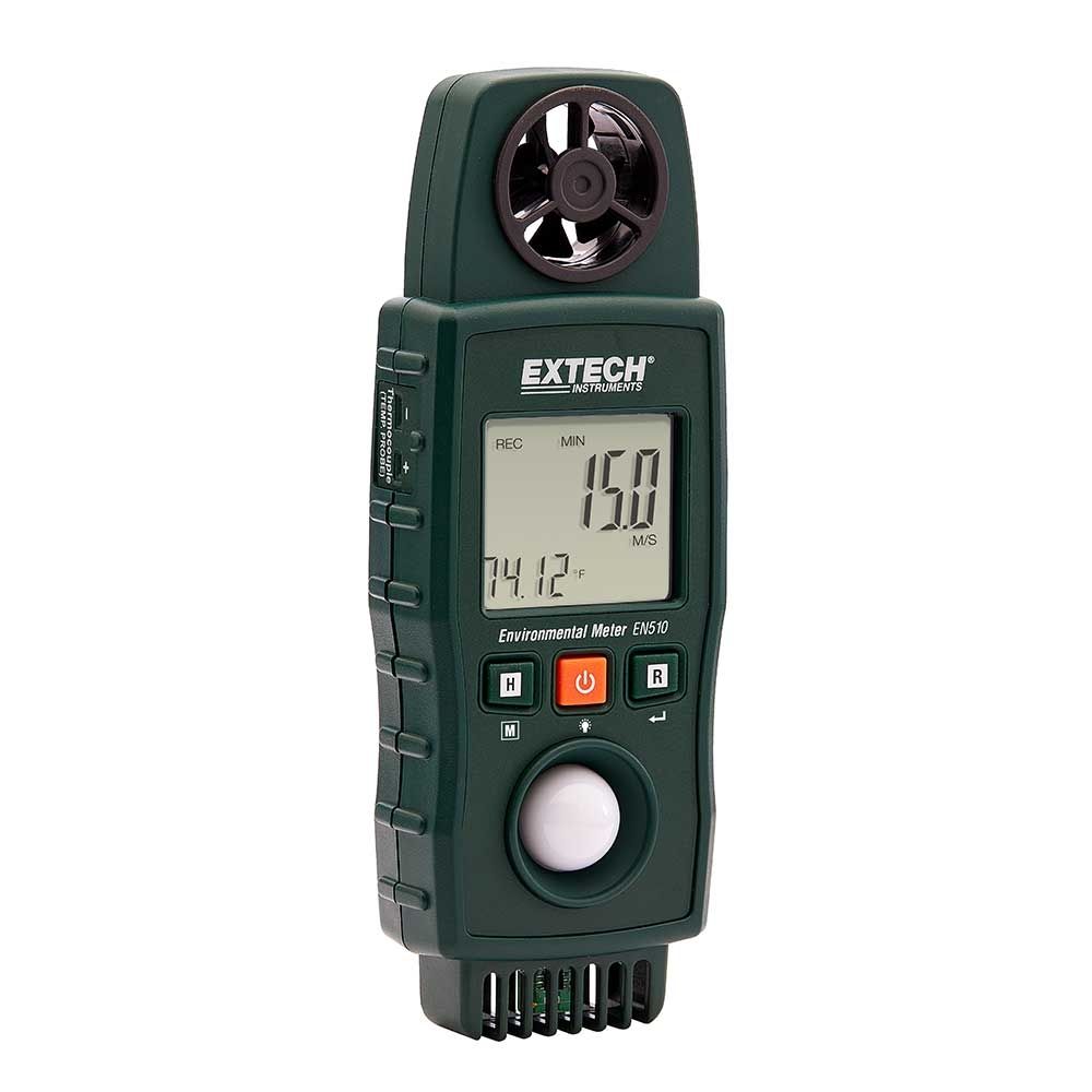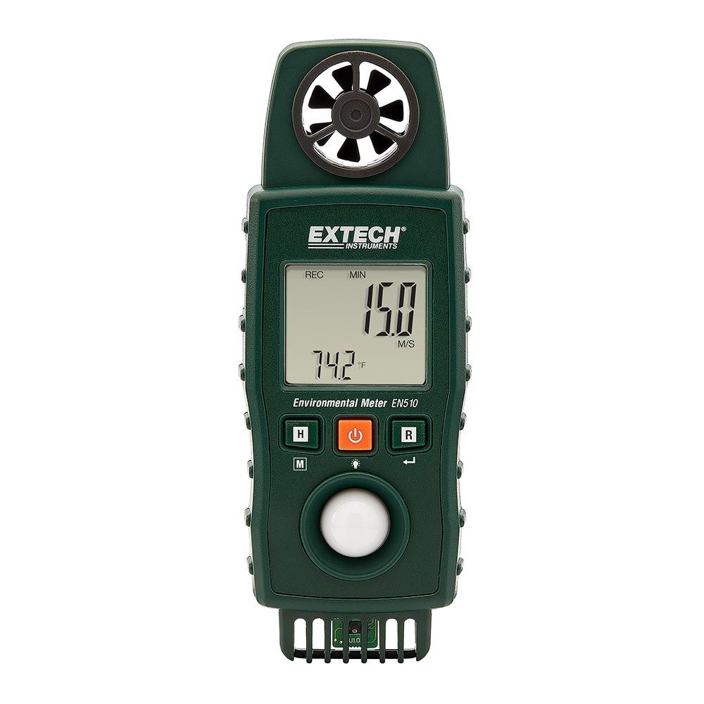 Measure air velocity, air flow, air and type K temperature, heat index, humidity, wet bulb, dew point, windchill, and light level. Includes low friction ball bearing mini vane wheel, a precision photo diode with cosine and color correction filter, and a capacitive humidity sensor for high accuracy. General purpose bead wire probe is included for measuring Temperature up to ~480°F (250°C), while the meter can measure to 2372°F (1300°C) if used with other probes