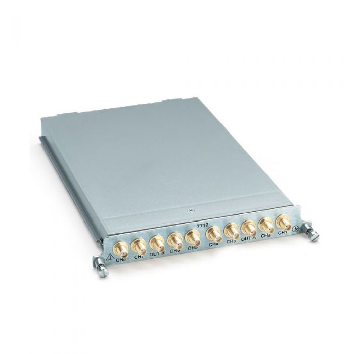 The 7712 plug-in module offers a 50W dual 14 multiplexer configuration with rear panel SMA 14 connectors. Multiple multiplexers can be cascaded to build scalable matrix and multiplexer systems for a large number of devices under test and RF source/measurement instruments. One channel in each multiplex bank is always closed to the corresponding OUT connector. The 3.5 GHz RF switching capability of the 7712 makes it ideal for testing wireless modules operating in the 2.4 GHz and lower industrial scientific, and medical (ISM) radio bands.