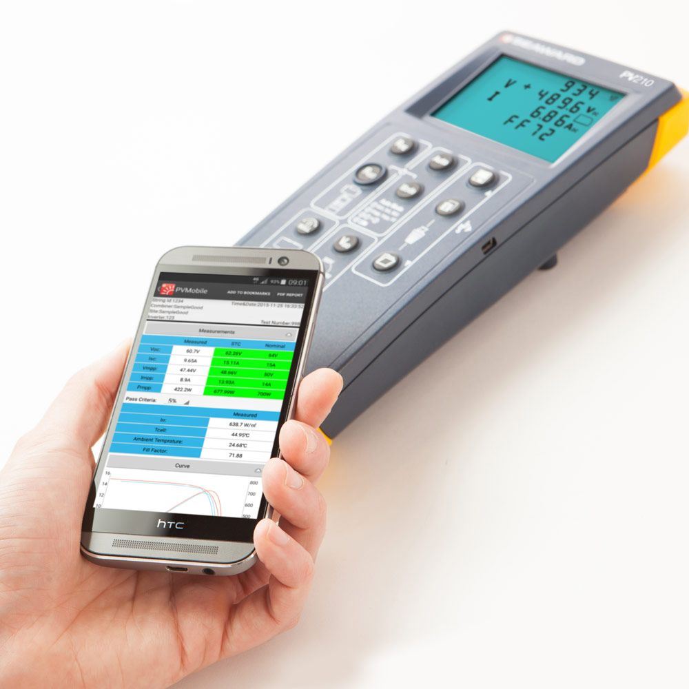 Seaward PV210 Solar Installation Test Kit Solar PV tester and I-V curve tracer The Seaward Solar PV210 PV installation tester provides a highly efficient and effective test and diagnostic solution for PV systems, carrying out all commissioning tests required by IEC 62446 and performing fast and accurate measurement of I-V curves in accordance with IEC 61829. Seaward PV210 Solar Installation Test Kit × With direct connection to individual PV modules or strings using the supplied lead sets, tests can be conducted easily and within a matter of seconds at the press of a single button. A high contrast display is clearly visible in direct sunlight and shows open circuit voltage, short circuit current, maximum power point voltage, current and power, as well as the fill factor of the PV module or system under test, and insulation resistance (as part of an auto sequence or a discrete probe to probe measurement). If the measured curve deviates from the expected profile, the PV210 alerts the user to this, identifying the need for further analysis. Detailed and colour I-V and power curves, can be viewed instantly once data is transferred to the PVMobile Android App using wireless NFC connectivity. PVMobile displays measured I-V and power curves for visual analysis of the curve shape, enabling common problems such as shading, defective cells or poor electrical connections to be identified. The PV210 is available as part of the Solarlink test kit which includes the Survey 200R irradiance meter. As well as being a comprehensive survey tool, the Survey 200R wirelessly transmits irradiance and temperature data to the PV210 so that it can be transferred to the PVMobile app alongside the rest of the test data. PVMobile can be used to convert measured data to STC for comparison with manufacturer’s published data.