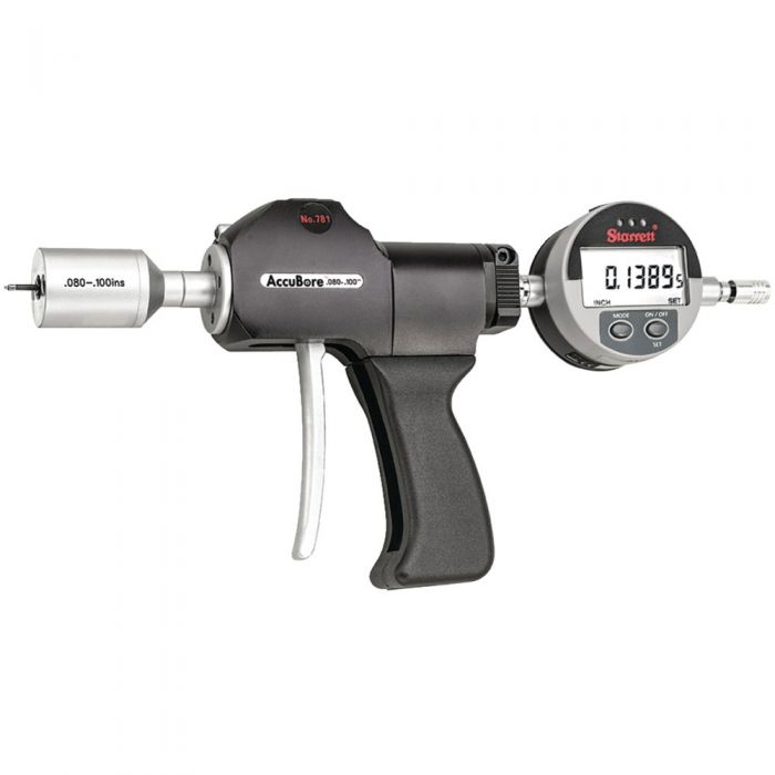 The Starrett AccuBore is a high-quality, trigger-activated, three-point contact bore gaging system with extended range. Its convenient single-hand operation provides speed and control. It also features an easy-to-read digital display as well as mechanically-driven parallel anvils which extend simultaneously, establishing a more true alignment to the axis of the bore, providing consistent pressure and more accurate readings as opposed to models with spring-driven contacts. The gage also features a set of go/no go lights that quickly indicate whether a bore measurement is within a preset tolerance window. Pistol Grip, .080-.100 (2-2.5mm) Range window.
